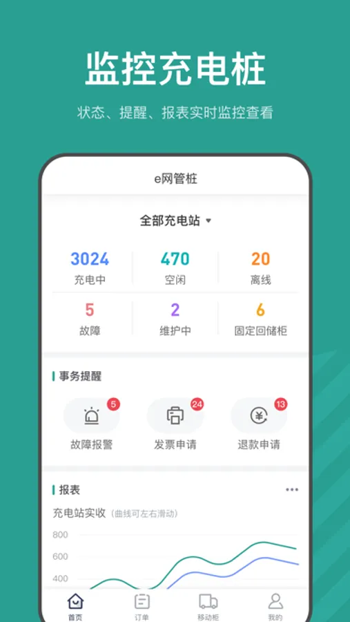 e网管桩是一款为充电桩管理提供简单、高效、专业的App。强大而专业的数据报表分析,实时精准把握运营情况。全方位为您提供充电桩管理服务。