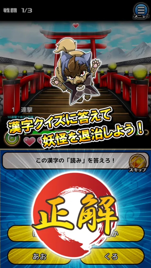 制限時間内に出題されたクイズに答え妖怪を討伐しましょう!