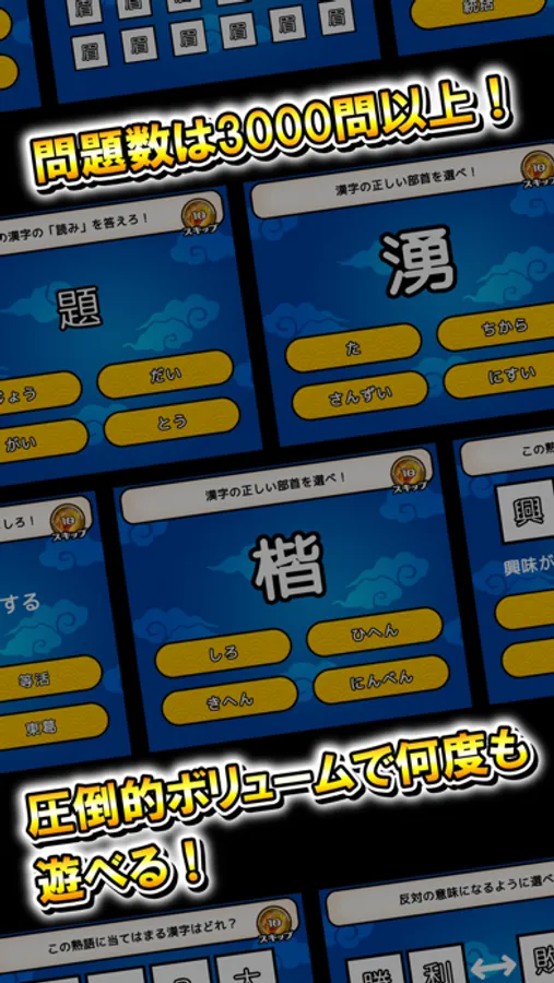 読み、四字熟語、部首、対義語など全8ジャンルの問題が3000問以上!