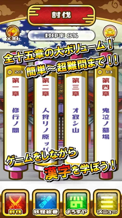 「妖討漢字伝~妖怪軍への挑戦!~」では楽しく漢字クイズができます!