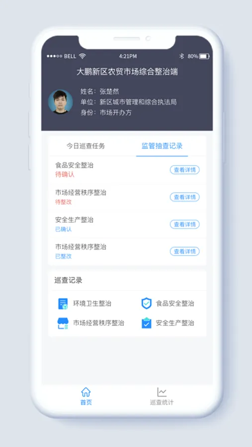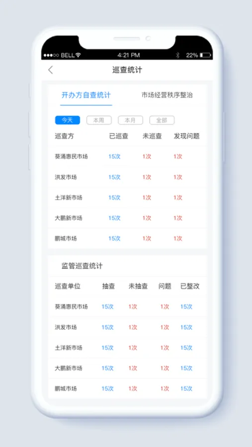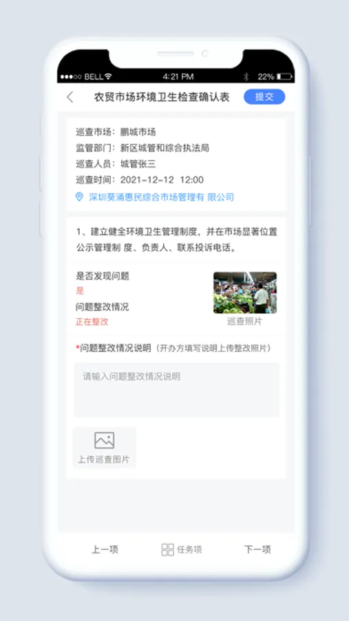 本软件提供政府监管执法部门以及市场管理者通过手机端对农贸市场的经营秩序,环境清洁,消防安全,证照公示,食品安全等迎检环节的现场拍照取证,记录问题,对市场进行评分。并下发违规需要整改的事项,让农贸市场开办方进行整改,并上传整改图片,执法人员进行审核。