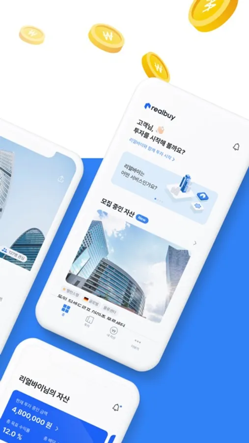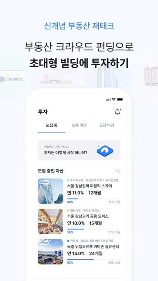 ∙ 강남 테헤란로의 오피스를 비롯하여 수도권 내 전 지역의 물류센터, 호텔, 백화점까지 랜드마크 자산에 투자를 시작해보세요.