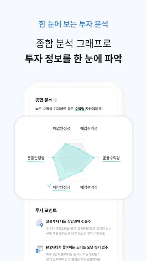 ∙ 부동산 전문가의 코멘트로 매입, 운용, 매각의 과정의 리스크를 한 눈에 파악할 수 있어요.