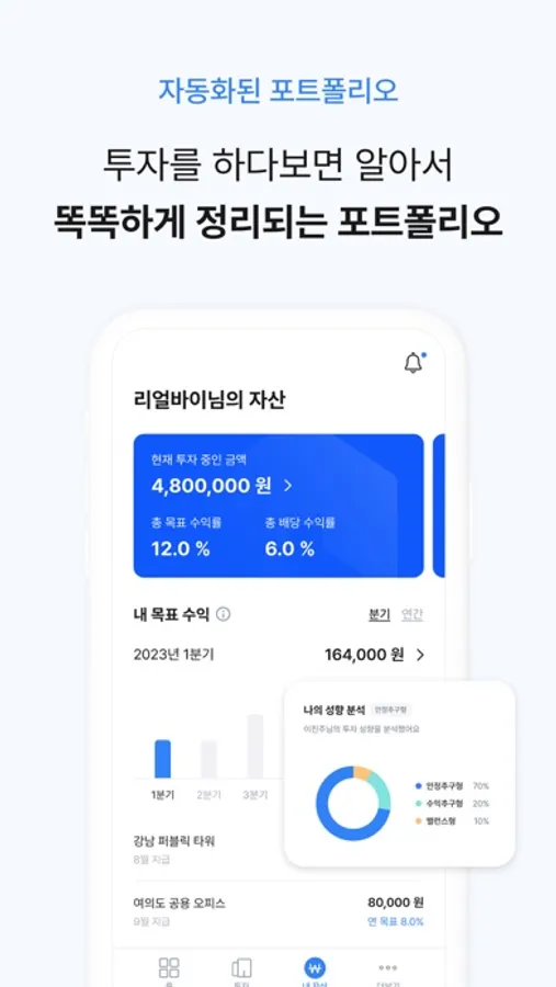 ∙ 안정형, 수익형, 밸런스형 자산 중 어떤 성향에 투자 중인지 그래프로 보기 쉽게 정리해드려요.