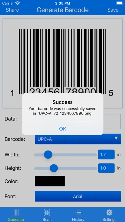Created barcodes can be varied by size, color, and font, saved as image files, or shared.