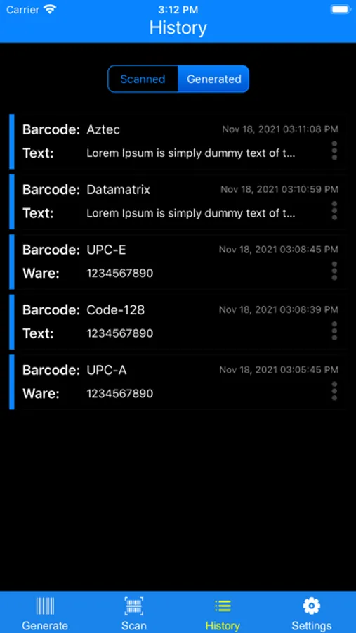 Scanned and created barcodes data are saved to history database, if the appropriate preference settings are made. Subsequent actions with stored data such as web search, share, and reproduce barcode are possible.