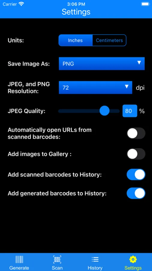 Using iBarcoder preferences you can set save image format, resolution (for JPEG and PNG), can also set to automatically open scanned urls, or add scanned images to Photos.