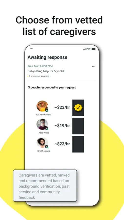 GET A LAST-MINUTE CAREGIVER who’s a friend or relative of someone you already know and trust – AND has been vetted for your comfort – for the couple hours when you need help. Whether it’s babysitting, pickup, or drop-off, just open the app, put out your ask and how much you’ll pay, and find an available caregiver nearby you can rely on.