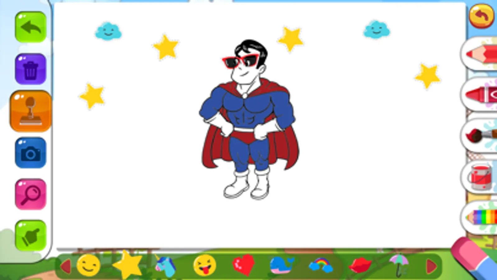 - Many drawing and coloring tools: crayons, pencils, watercolors, fills, stickers, photography…