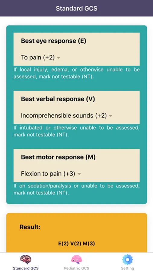 - Simply choose between standard GCS score or pediatric GCS score feature.