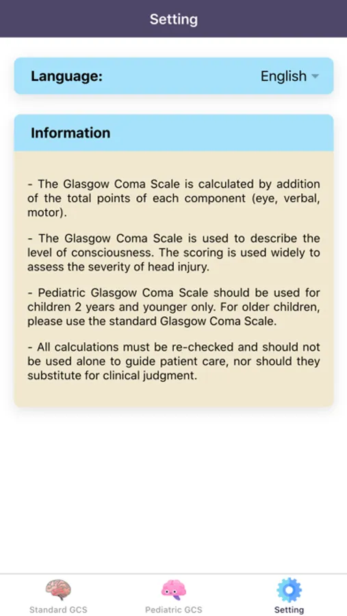 Disclaimer: all calculations must be re-checked and should not be used alone to guide patient care, nor should they substitute for clinical judgment. Calculations in this "Glasgow Coma Scale: GCS Score, Consciousness Level" app might be different with your local practice. Consult to expert doctor whenever necessary.