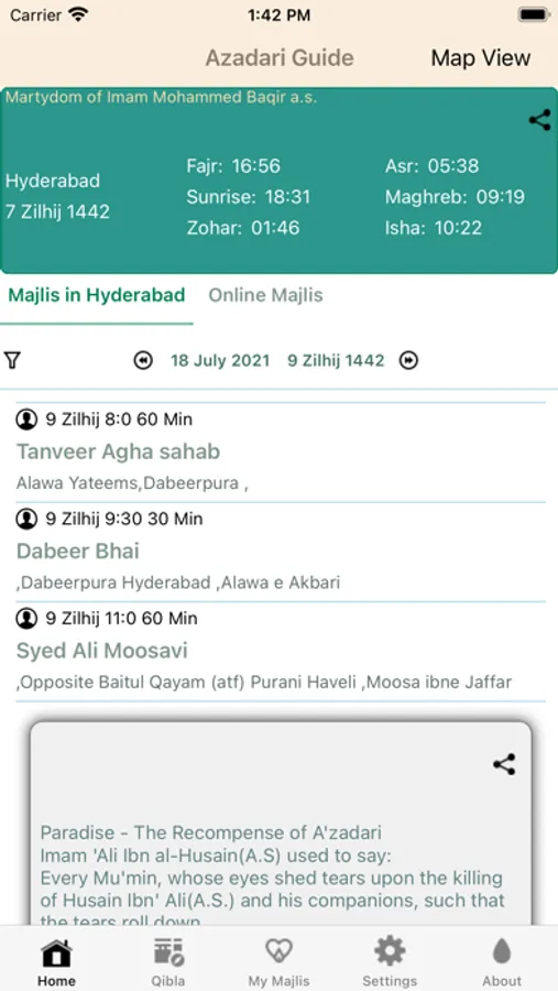 Azadari Guide displays Shia Salat timings, Hijri Dates, and Important Islamic Events. It also displays the list of Majlis taking place in your city. It can provide Google Navigation to the Majlis venue. It has a Map view to look for Majlis being conducted closest to you.