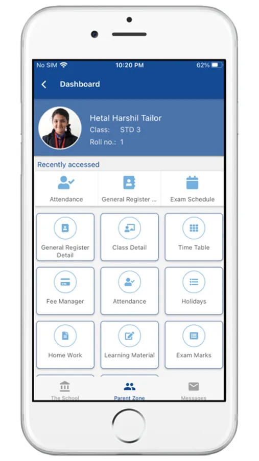 (2) Parent Zone - Parents can see their kid's personal records in this section. For example - General Register details, Time Table, Attendance, Exam Results, Home Work, Fee payments etc. Parents will have to register into the app using the same mobile number which is supplied for school General Register record.