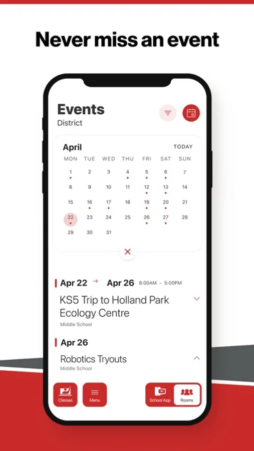 The event section shows a list of events throughout the district. Users can add an event to your calendar to share the event with friends and family with one tap.