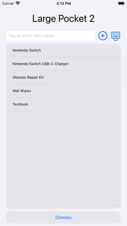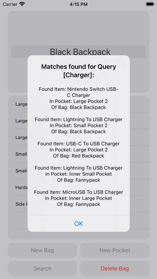 After making and naming a bag, you can add pockets, and both can be named to meet your exact needs. You can add a list of items to each pocket, and from the main page, all bags can be searched by the name of the item you're looking for. If matches are found, you'll be told which bag any matches can be found in, as well as which pocket, so you don't need to spend so much time burrowing through 3 bags and every pocket in them.