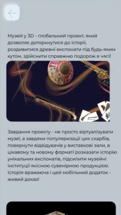 "Музей у 3D" — промоційний проєкт, частина імерсивної платформи, мета якої привернути увагу до музейних скарбів, здійснити якісне оцифрування цікавих експонатів та розказати про них у новий, інноваційний спосіб.