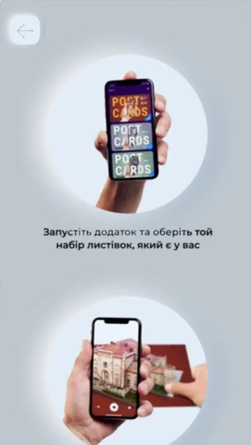 Для того, щоб роздивитись пам’ятки, натисніть «Почати» та наведіть камеру на друковану поштівку — перед вами на екрані з’явиться експонат у AR. Паралельно звучить аудіосупровід.