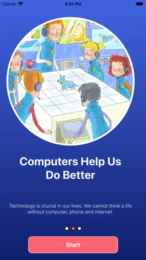 The app offers a reading interface for the original story with illustrations and wording. A Tic Tac Toe game is also included. The story is about a group of kids visiting inside the computer. They travel inside the computer to the processor, the disk, the screen, the mainboard and the keyboard. They learn basic technical information about software and hardware.