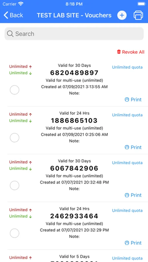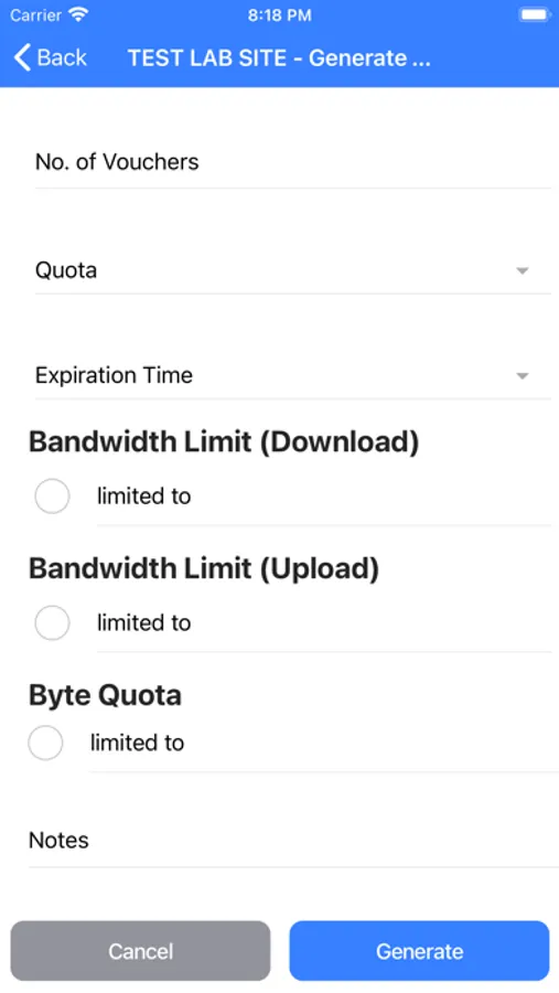 When you add new vouchers, you have flexibility to create time limited, data volume limited, bandwidth limited, one voucher for number of devices, and/or unlimited vouchers with labeled notes to remember the batch.