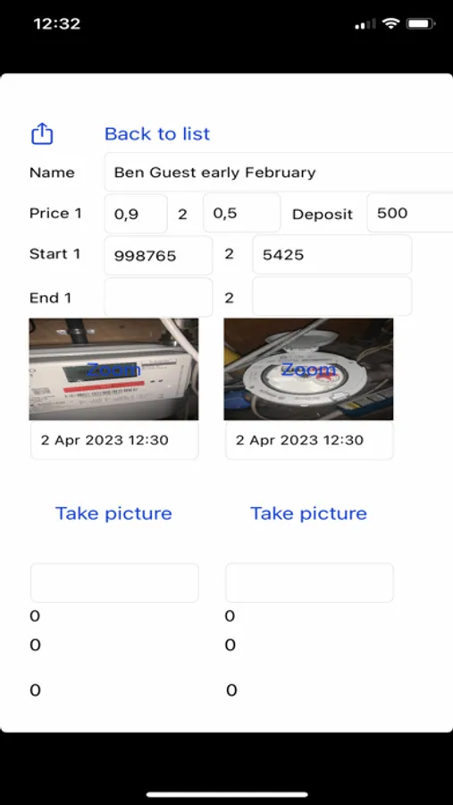 Easily manage water and electricity usage for your rental properties. Simply enter the price for up to two resources (usually water and electricity), and together with the guest, at the start of their stay, take a picture of the water and electricity meters as evidence for the manually entered numbers. Do the same at the end of their stay, and the app will calculate the amount the guest needs to pay, or more commonly, you subtract the amount they need to pay for their usage from their deposit. Quickly share a PDF document, including pictures of the meters, with your guest.