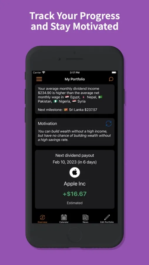 To foster the motivation to invest, we have added sections with quotes by famous people, a comparison of your passive income with the average salary in different countries, and the option to set a passive income goal.