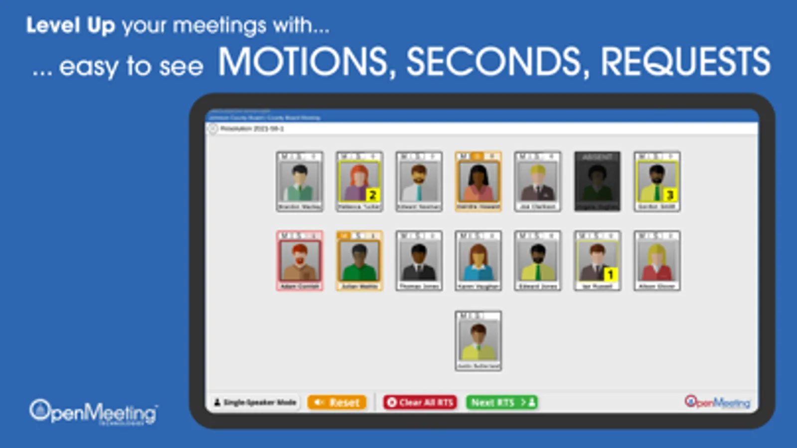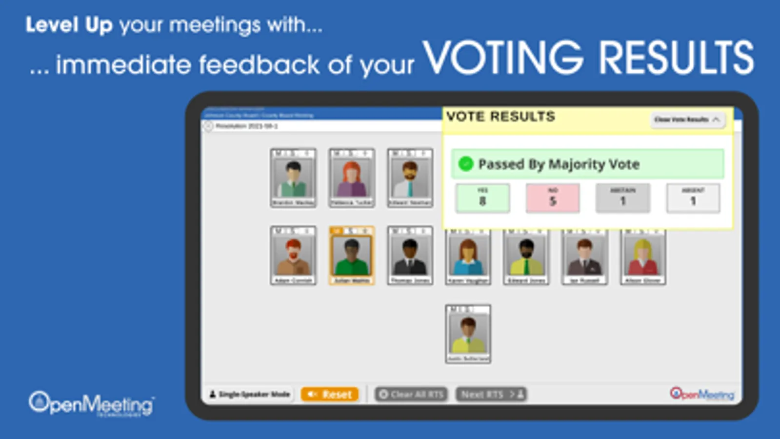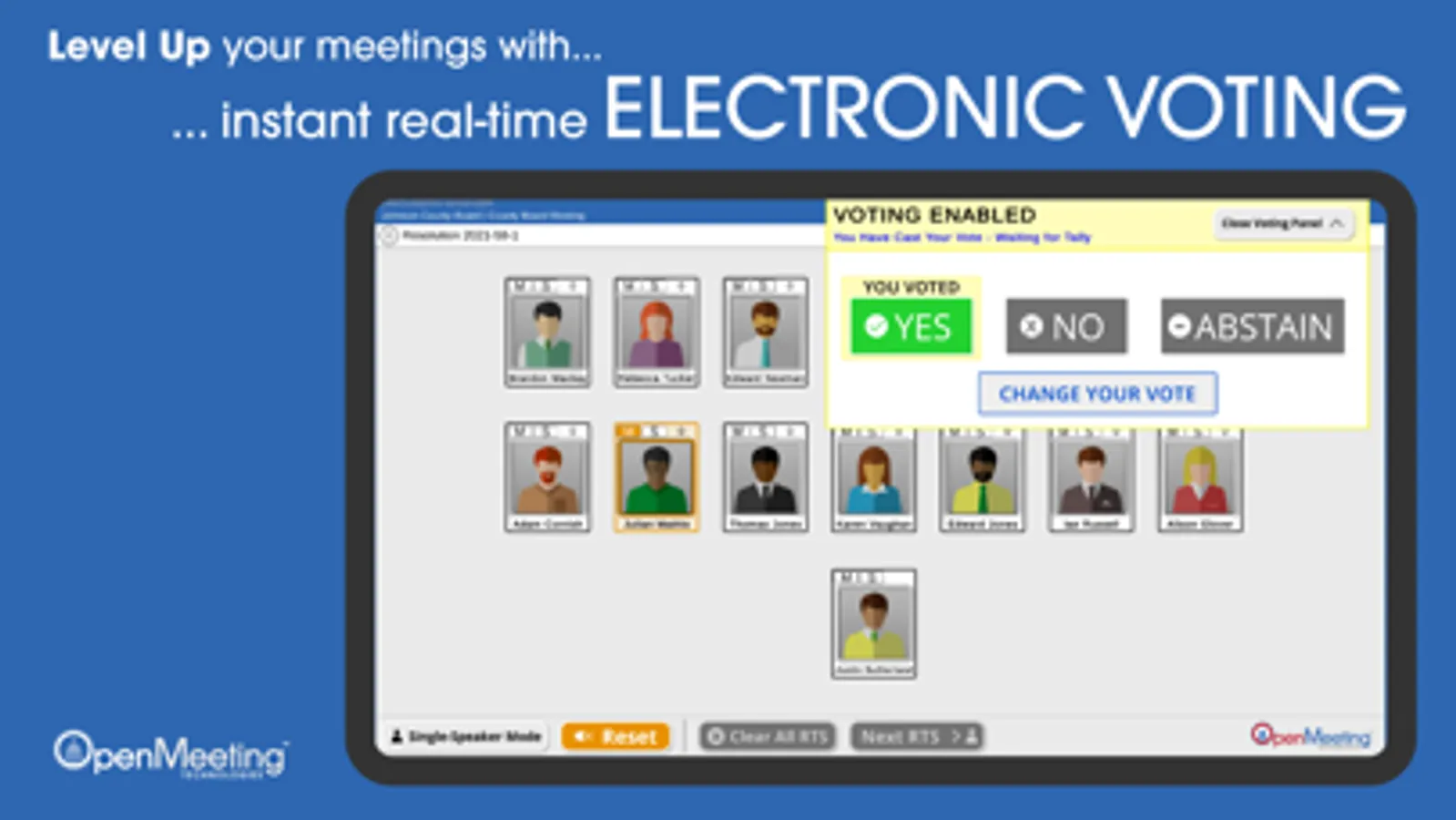 OpenMeeting is the gavel-to-gavel legislative meeting solution trusted by county and local governments across the county. OpenMeeting enables easy meeting setup, agenda management and visualization and control of procedures including roll call, voting, discussion manager with camera and microphone integration, public display, meeting logs and so much more. Flexible and customizable to fit your needs, OpenMeeting exists to make your life easier and help you run better meetings.