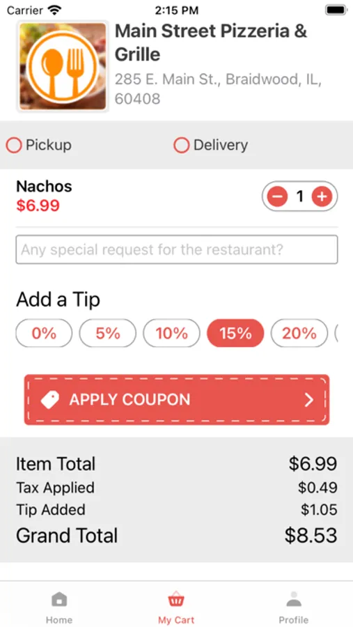 2. Main Street Pizzeria & Grille is going digital now and has it's own online ordering app. If you want to order delicious food from us, just download our app and place order in 3 quick steps. Build your order just the way you like it or choose one of our combo from the menu. Add items from the rest of our robust menu. And with the order Tracker ® you can follow your order from the moment you place it until it’s out for delivery, carryout or pickup.