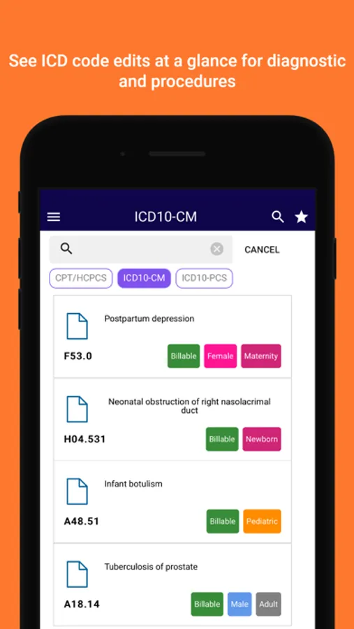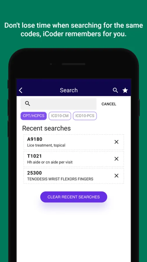 iCoder will show you all ICD10 that match your chosen CPT® code and even display your favorite diagnostics that match your CPT® code first.