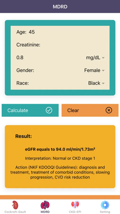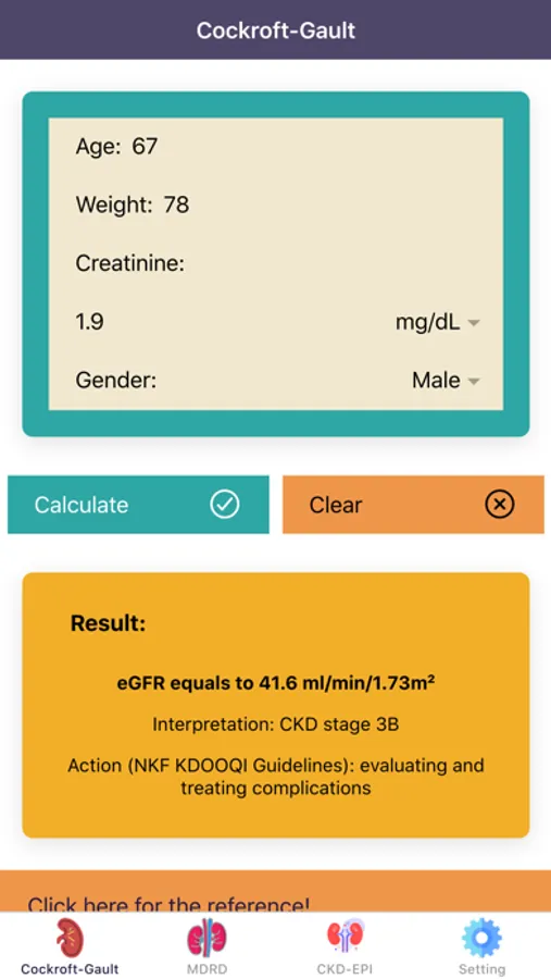 "eGFR Calculators Pro: Renal or Kidney Function" will interpret the Glomerular Filtration Rate (GFR) result and determine the stage of Chronic Kidney Disease (CKD). "eGFR Calculators Pro: Renal or Kidney Function" also provides recommended action based on staging of Chronic Kidney Disease (CKD). "eGFR Calculators Pro: Renal or Kidney Function" has a friendly user-interface. User can shift between the formulas in a click (e.g. Cockroft-Gault to MDRD or CKD-EPI) and choose the unit of serum creatine easily between mg/dL or micromol/L.