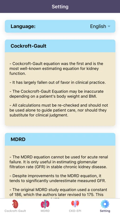 Disclaimer: all calculations must be re-checked and should not be used alone to guide patient care, nor should they substitute for clinical judgment. Calculations in this "eGFR Calculators Pro: Renal or Kidney Function" app might be different with your local practice. Consult to expert doctor whenever necessary.