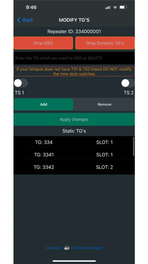 The easiest way to add or remove TG's from your Brandmeister hotspot!!! you can drop your current TS QSO or even Dynamic TG's all within the app!.