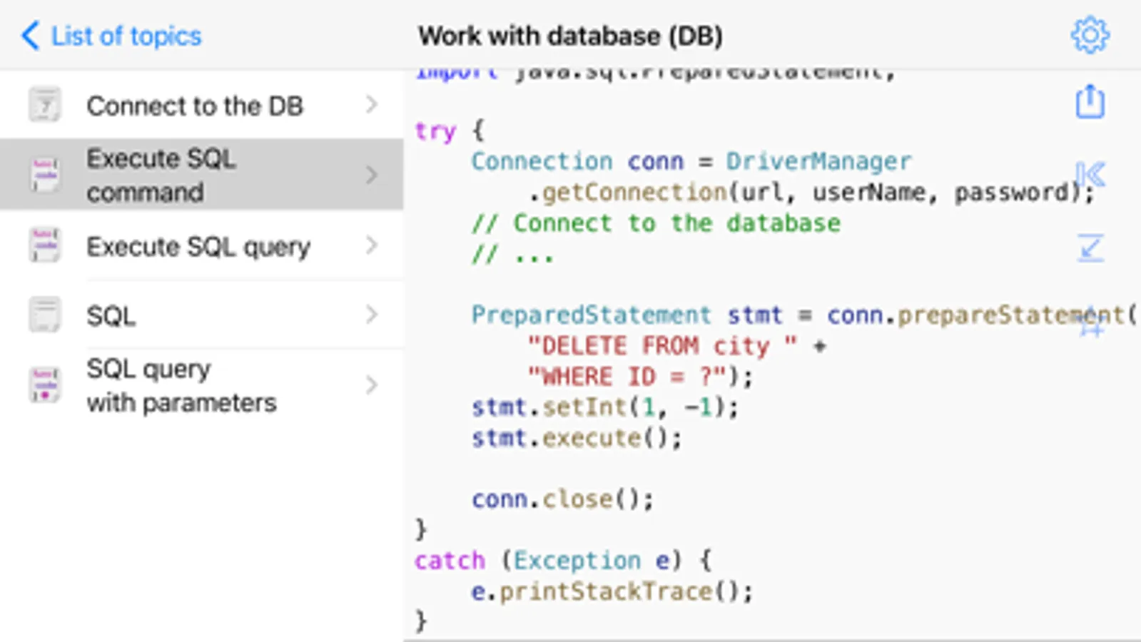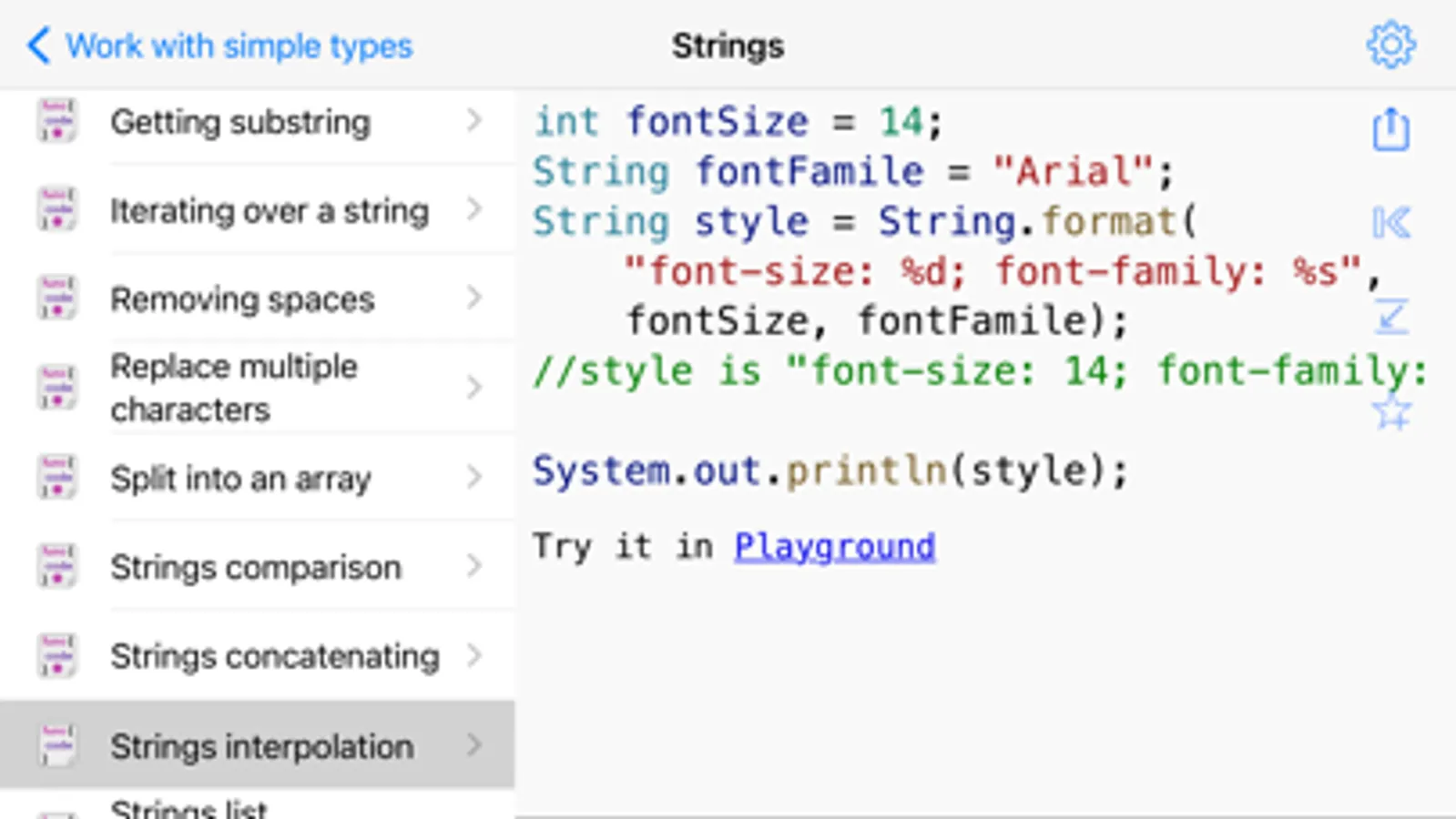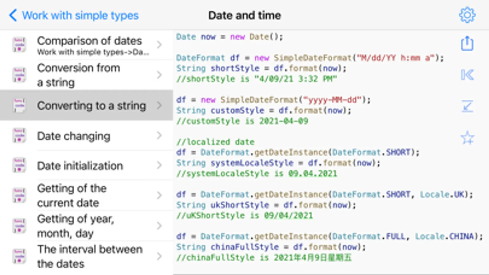 • The application is a good tool during the exam or the preparation to the interview because it contains a reference to frequently used operations in different programming languages.