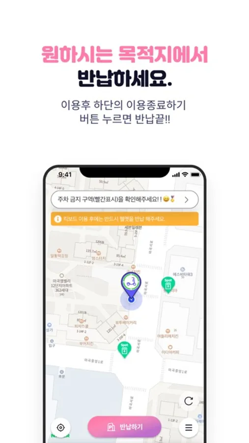 • 목적지 주변 휙스팟에 주차하고 반납해요.
