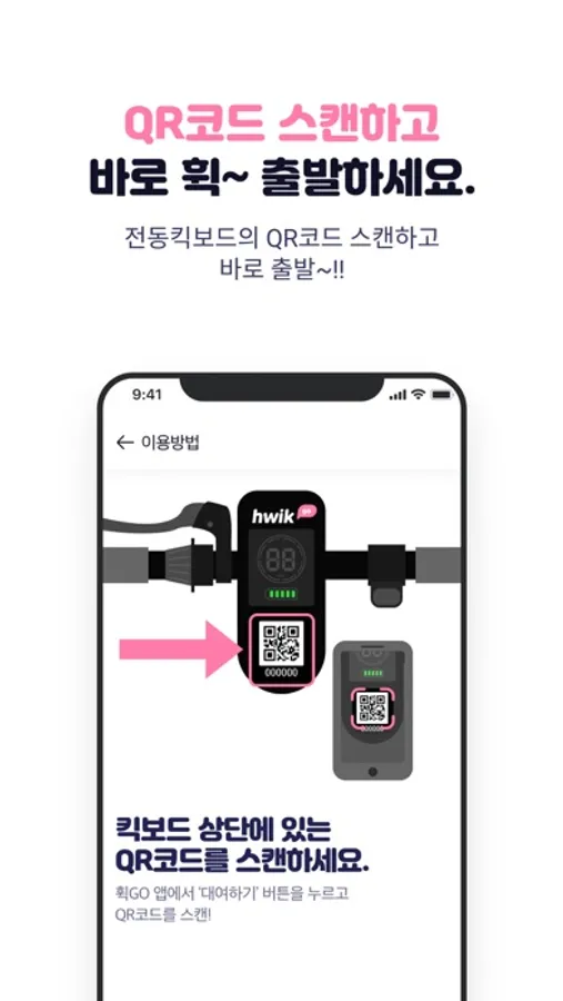 • 킥보드 상단의 QR코드를 스캔해서 전동킥보드 잠금을 해제하세요