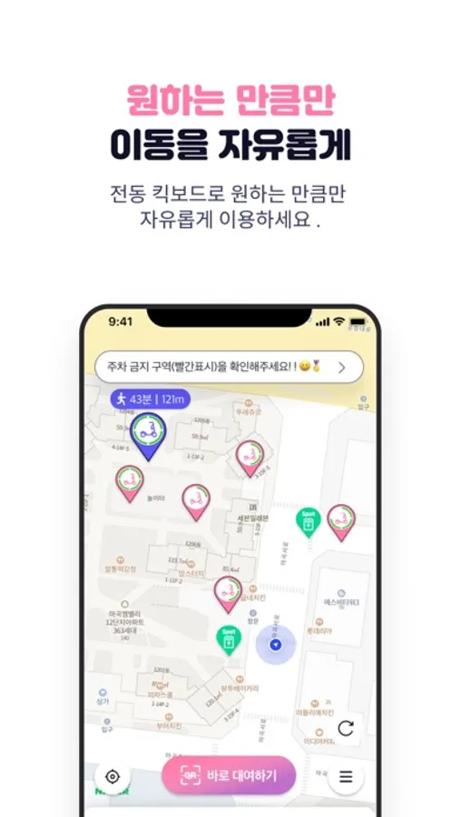 • 지도에서 주변에 있는 전동킥보드를 찾아보세요