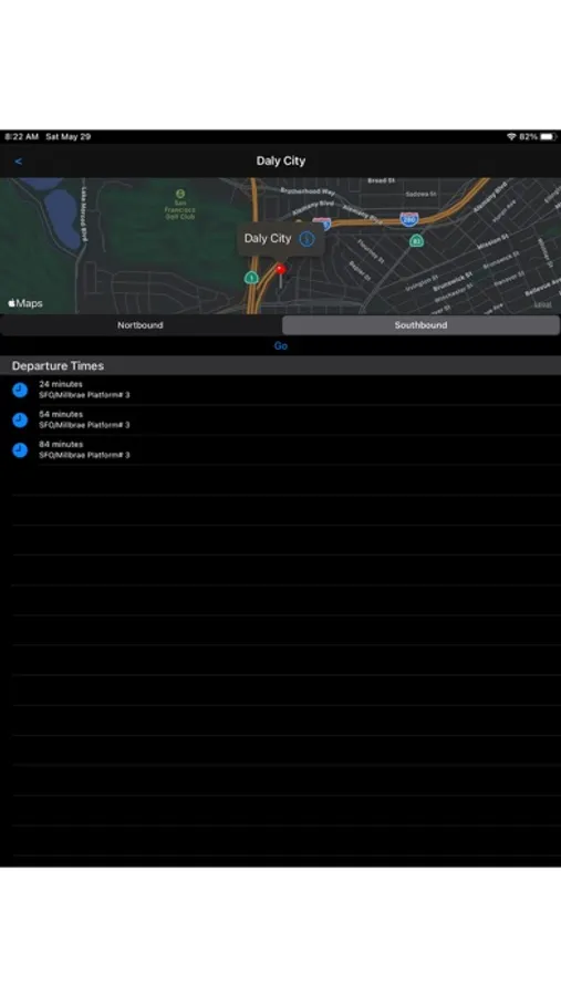 Clicking on a BART station on either the interactive map or the tabular view, will show all departure times of the selected station, in either the northbound or southbound direction, in real-time.