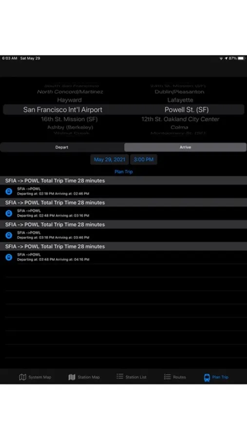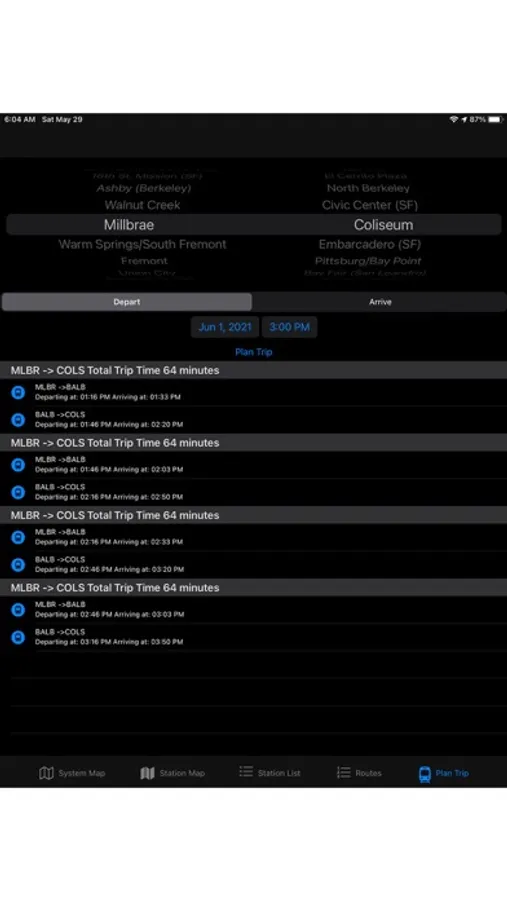 The trip planner will provide a trip list, based on either the intended departure date/time or the intended arrival date/time.