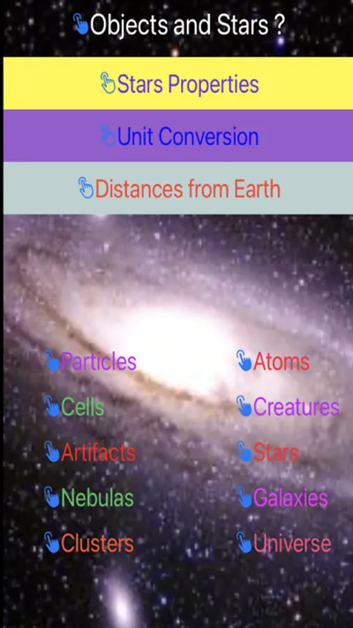 Size of objects, particles, atoms, cells, stars and galaxies.