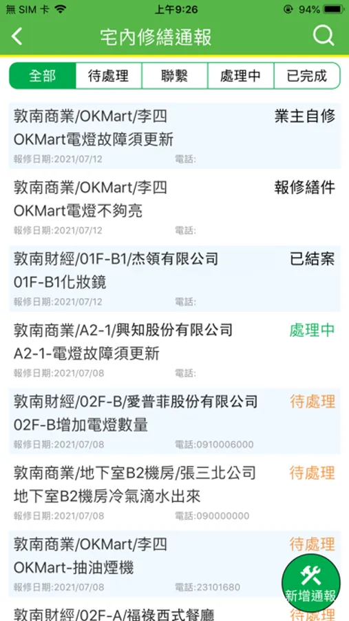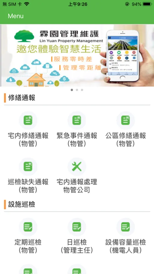 1.修繕通報:宅內修繕通報,緊急事件通報,公區修繕通報,巡檢缺失通報,宅內通報處理