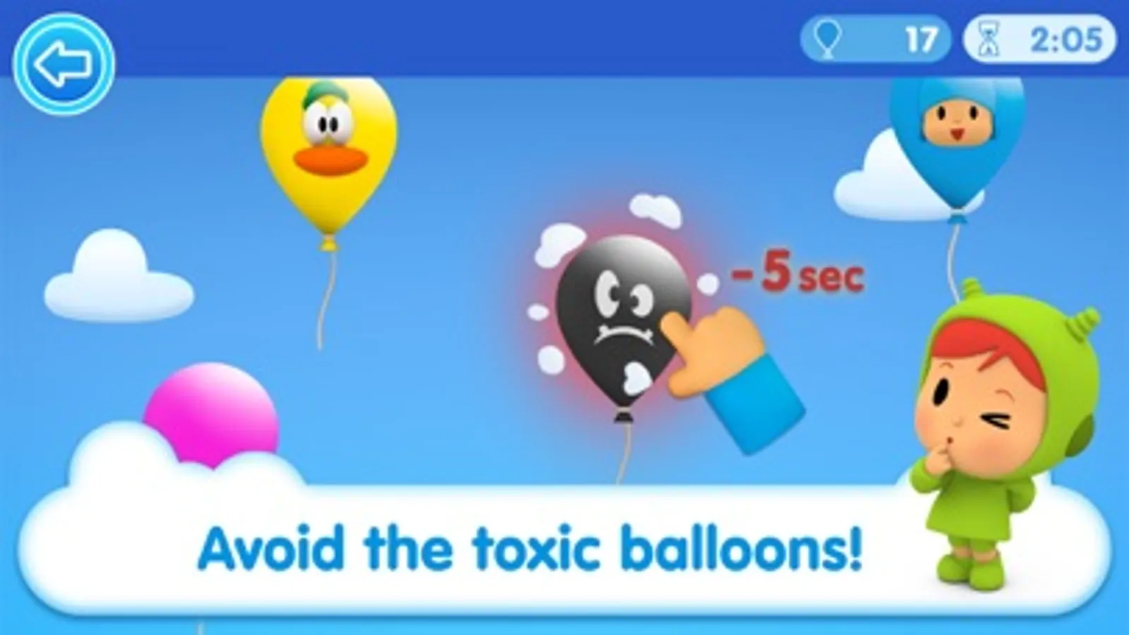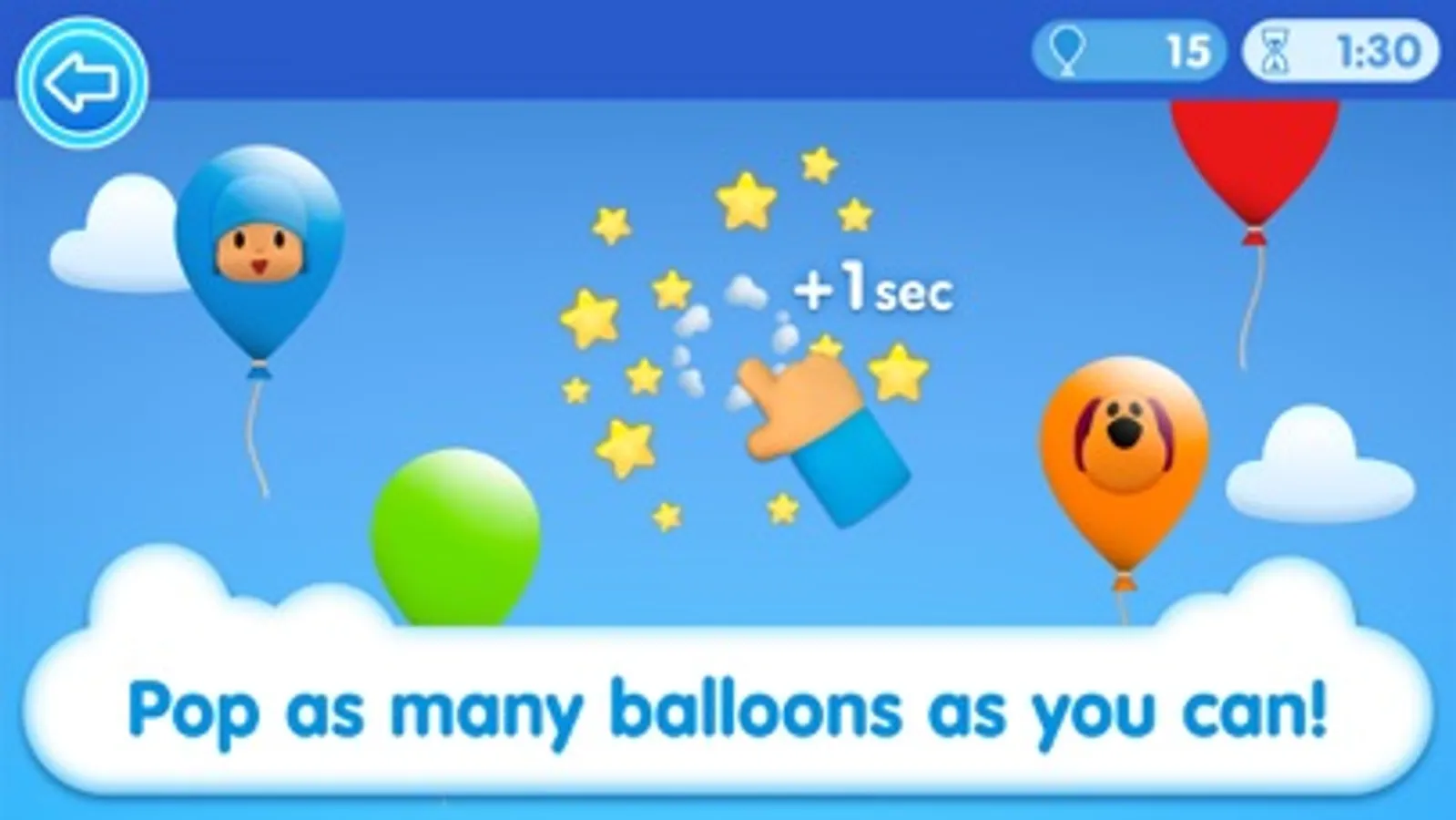 - At the Easy level, coloured balloons simply appear at the bottom of the screen and slowly move upwards. When touched, they pop, making different sounds depending on the type and colour of the balloon. In this mode there is no time limit, so it is ideal for children ages 2 and younger.