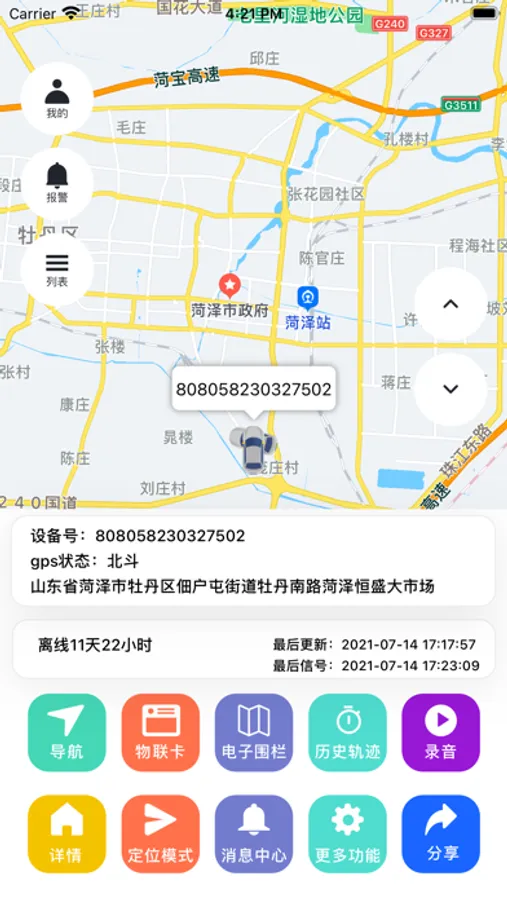 3.电子围栏:可以以车为中心设置电子围栏,车辆越过圆圈范围,设备会发送及时提醒。