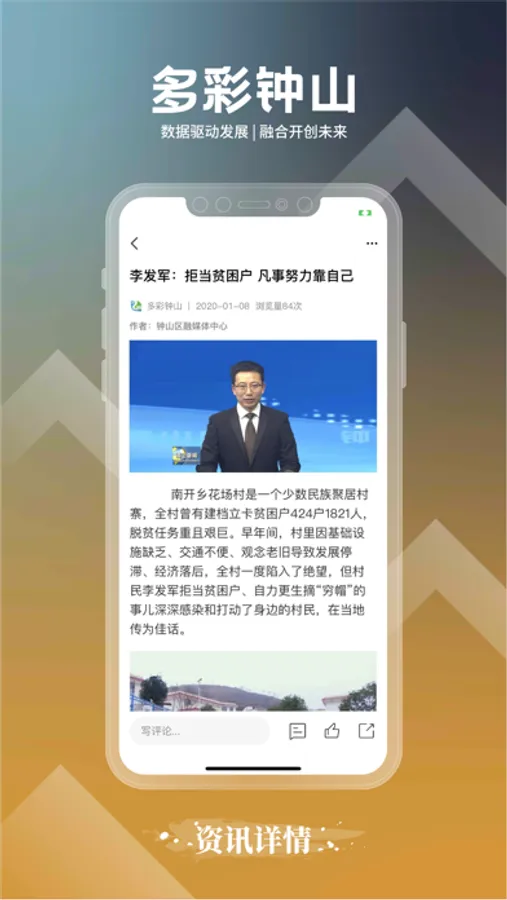 多彩钟山”是钟山区融媒体中心和钟山区新时代文明实践中心融合平台,有新闻发布、政务办理、民生服务查询、志愿服务等功能,提供“新闻资讯、文明实践、政务服务、商务服务、党建服务、民生服务、应急广播”服务,实现“新闻+政务+服务+商务+党建+应急广播”的目标