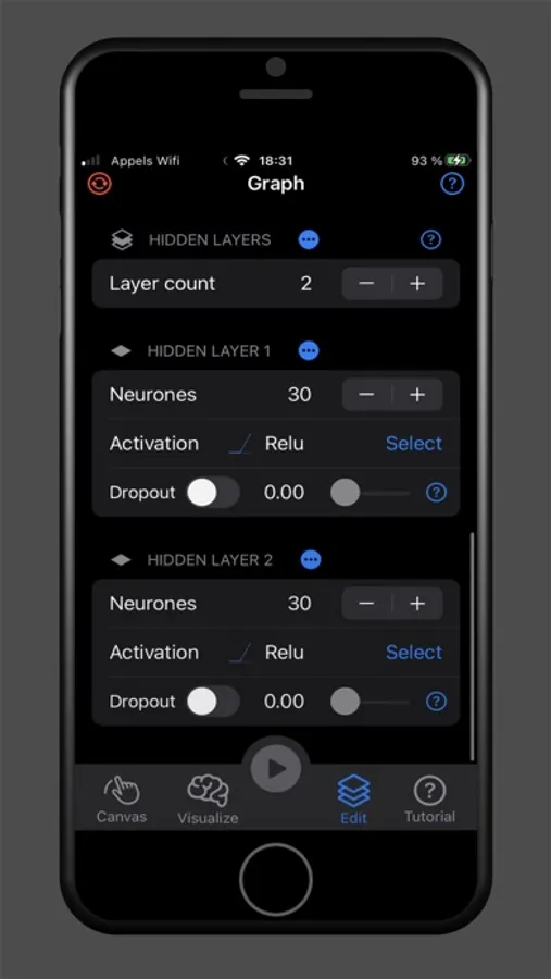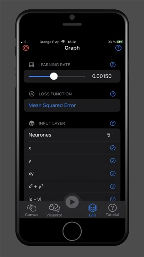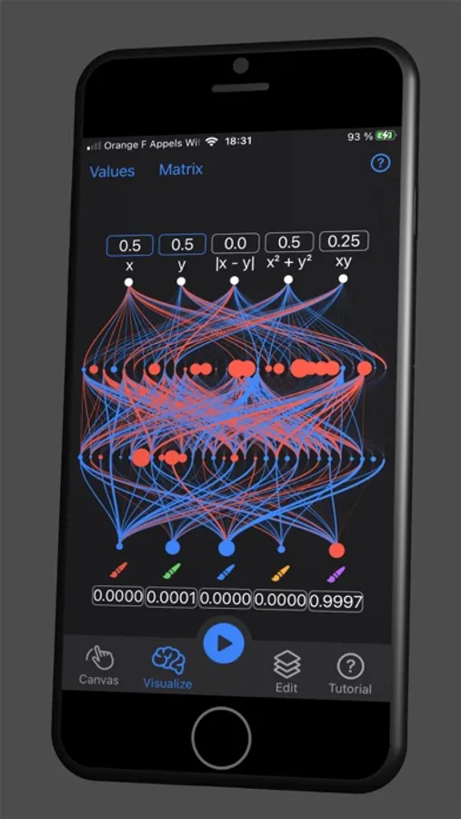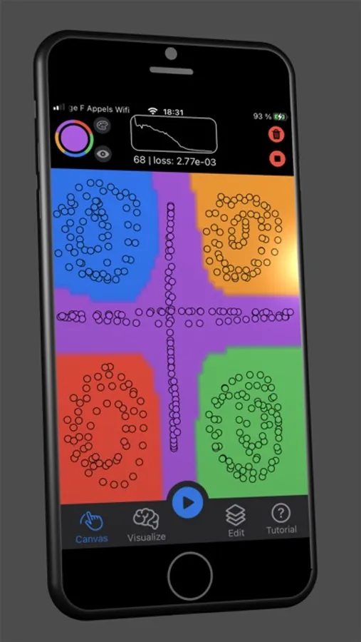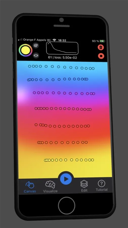 Start the training and observe how the machine infers the relation between coordinates (input) and color (output) from the dots you've drawn. To understand the "brain" of the AI (the "graph") you can change its parameters and observe how different configurations lead to different performance.