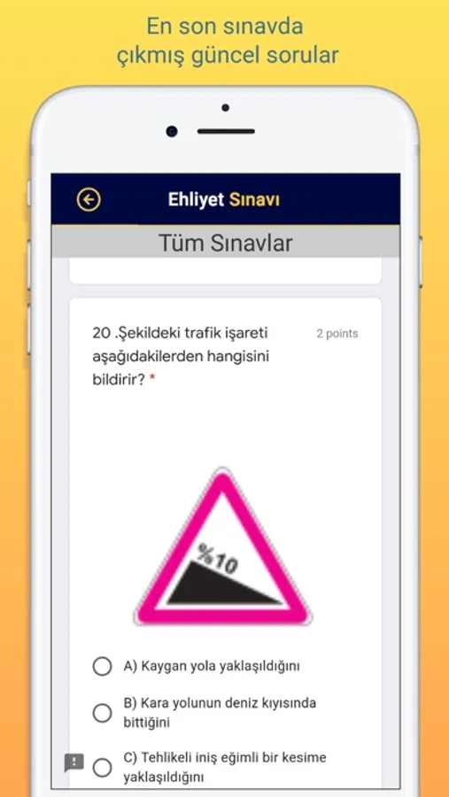 2023 Güncel Ehliyet soruları ve geçmiş yıllarda çıkmış sorular ve konu dağılımları, ehliyet pratik ders notları cep telefonunuzda. Sadece telefonunuzu kullanarak sınavda çıkmış tüm sorulara ulaşabilirsiniz. Sınav sorularını çözdükten sonra sonucunuzu anında öğrenebilirsiniz. Doğru ve yanlışlarınızı uygulama sayesinde görebilirsiniz.