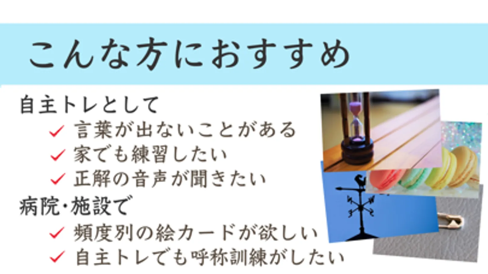 従来の絵カードの代わりとして、使用できます。軽度の失語症用訓練のため、特に難しい単語を揃えました。