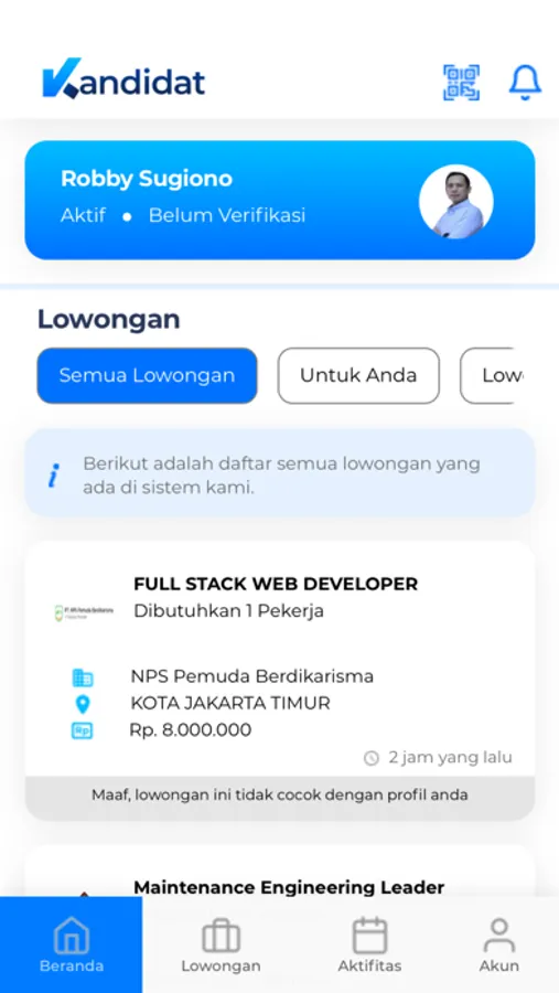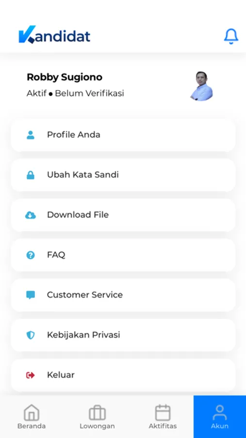 KANDIDAT memberikan kemudahan kepada para pencari kerja untuk dengan mudah terseleksi secara sistem jika terdapat lowongan kerja yang sesuai dengan kualifikasi yang diberikan pada saat pendaftaran di awal. Para pencari kerja diharapkan dapat memberikan informasi berikut kualifikasi diri mereka secara akurat agar dapat menikmati fitur-fitur yang disediakan oleh KANDIDAT.