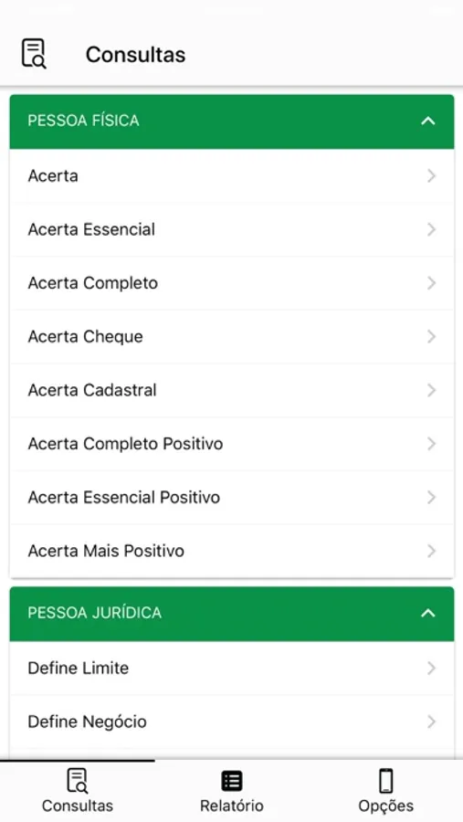 Além das consultas mais habituais, e o score de crédito, também estão disponíveis neste aplicativo as consultas das famílias Acerta e Define.