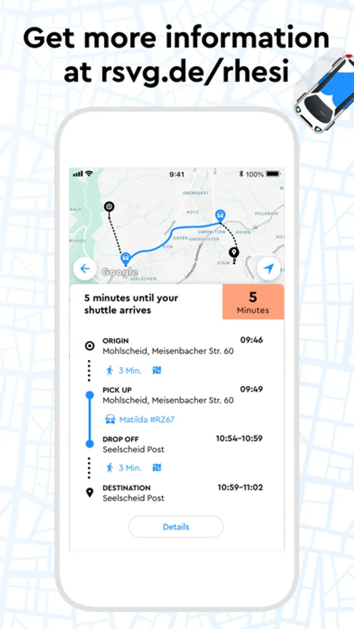 Mit Rhesi kannst du einfach und flexibel per App deine Fahrt zu über 100 Zielen in Neunkirchen-Seelscheid buchen. So erreichst du die Hauptorte und alle Ortschaften, Siedlungen und Weiler. Rhesi ist ohne festen Fahrplan und Linienweg unterwegs, bündelt die Buchungen mehrerer Fahrgäste und ist dadurch besonders umweltfreundlich. Diesen individuellen Service gibt’s täglich von frühmorgens bis spätabends zum regulären VRS-Tarif.