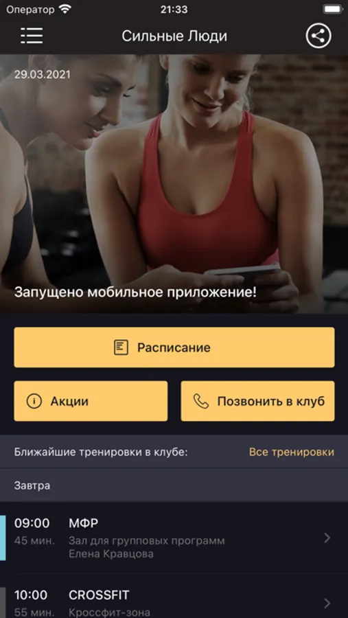 С помощью приложения вы можете следить за акциями, новостями, расписанием тренировок. Выполнять запись на занятия и пользоваться системой лояльности клуба.