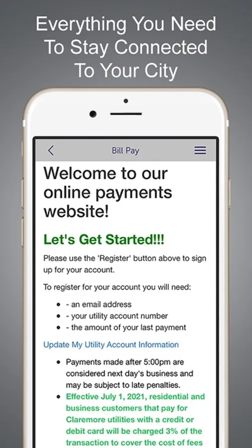 Learn everything you need to know about Claremore by downloading the official app. You will find it easier than ever to stay connected with the City of Claremore, Oklahoma, with just a few taps on your mobile device. Find helpful numbers, meet your elected officials, locate parks and facilities, access services, pay your bill online, stay informed and discover new ways to explore Claremore.